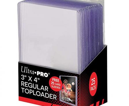 Super clear, regular 3" x 4" Toploader for standard size cards (2-1/2" x 3-1/2"). Rigid plastic encloses card and keeps it clean while preventing damage. Packs of 25.
