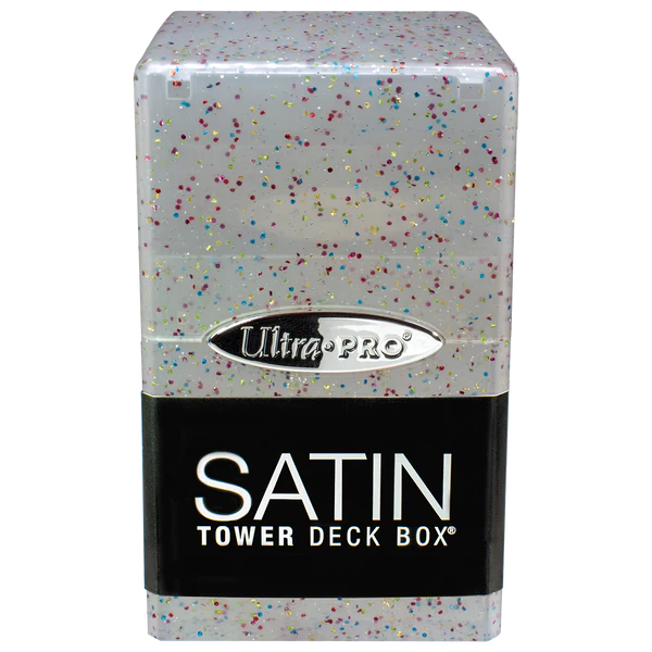 The Satin Tower is Ultra PRO’s best selling Deck Box The durable, injection molded plastic shell is designed to store and protect 100+ standard size trading cards in Ultra PRO Deck Protector sleeves and includes a spacious bottom compartment for dice, coins, or life counters. The unique snap-fit locking mechanism keeps your valuable cards and components securely stored. This Satin Tower features a Glitter finish, but Satin Tower is also available with Hi-Gloss and Classic Satin finishes! Collect them all!