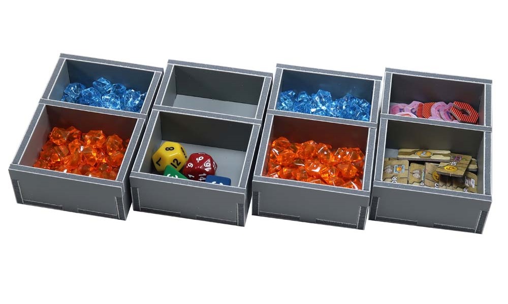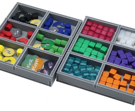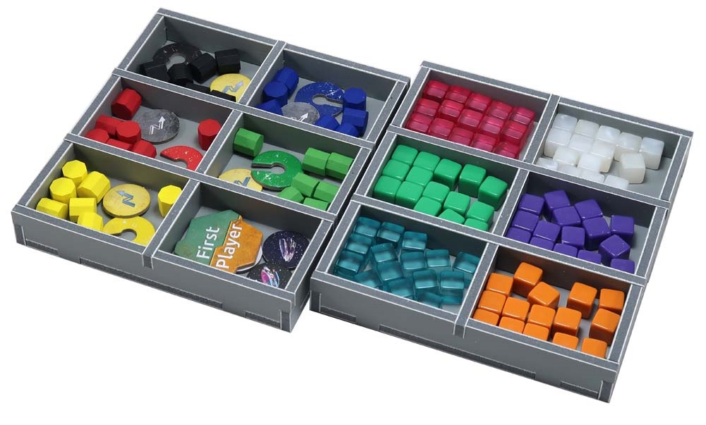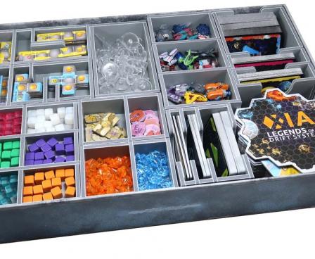 Insert compatible with Xia: Legends of a Drift System®, including the Embers of a Forsaken Star®, Sellsword®, and Missions and Powers® expansions. The design provides both efficient storage and improved game play. The trays can be utilised during the game, and they greatly aid set-up and clear-away times. The rules and boards act as a lid on top of the trays.