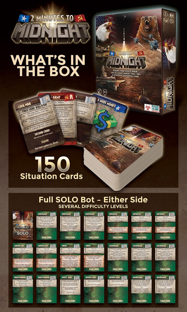 2 Minutes to Midnight is a fresh design exploring the cold war in 5-year turns starting in 1946 and running for 9 turns to 1990.