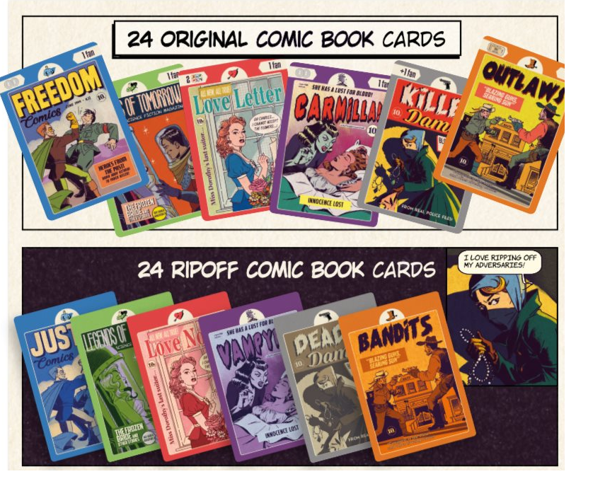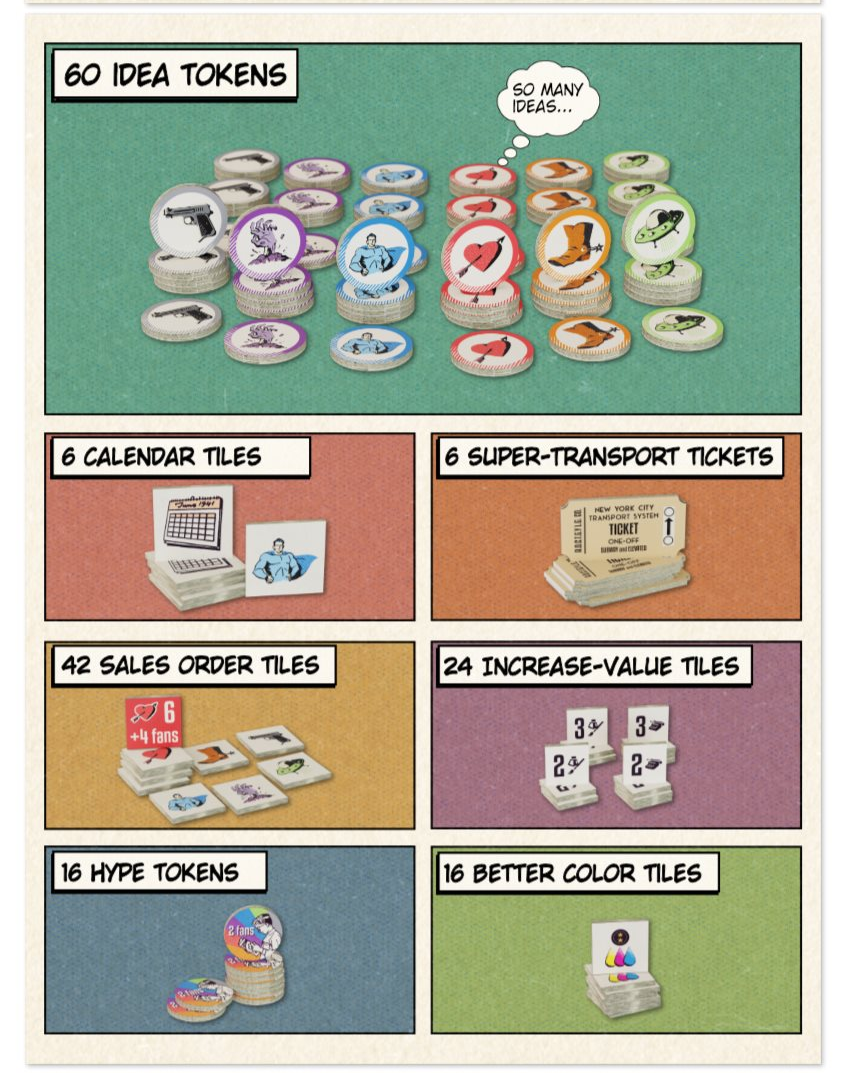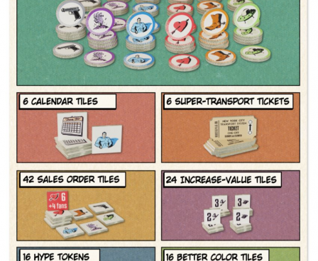 All Kickstarter stretch goals: boards, punchboards, and card quality upgrade; scorepad; spot UV printing; Public Enemy Number 1 cards; special sales order tiles; illustrated portraits of our playtesters, artists, and backers on all creatives cards; screen printed wooden components; inside box print; 12 objective cards.