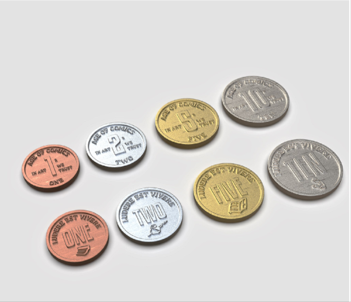 72 custom metal coins designed specifically for Age of Comics: The Golden Years, in four different denominations:
