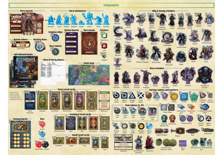 Agemonia is a fully co-operative board game with challenging, moral choices, set in an expansive storyline. Live your destiny, and become the mightiest of unlikely heroes — or even the most despicable of villains — in this unforgettable adventure! Agemonia, an enchanted world brimming with magic, is experiencing its greatest upheaval. Earth tremors, tidal surges, electrical storms — the cataclysmic events are increasing and driving the mortal races to the brink of war. What could this have to do with the resurgence of mysterious, ancient devices? And what of the approaching darkness that reaches from beyond the shadowy gates of the Breach?