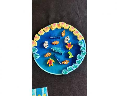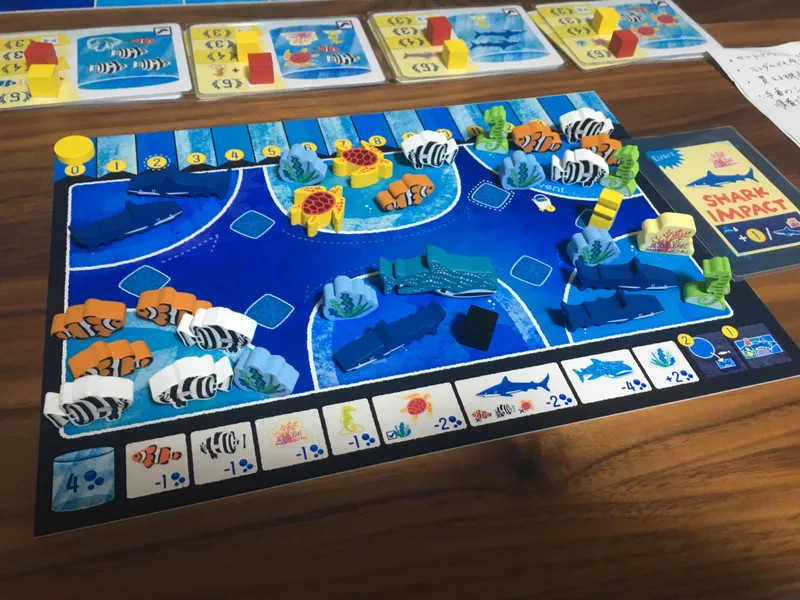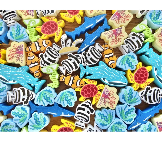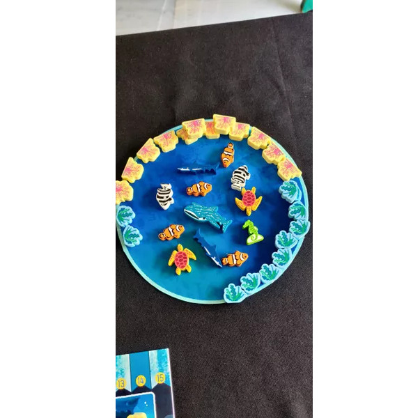 A game lasts 3-4 rounds depending on the number of players. You have your own aquarium board with six tanks, and a shared player board has sea creatures placed at random on its perimeter. Seaweed and coral tokens are placed on the separate sea board, along with five random sea creatures.