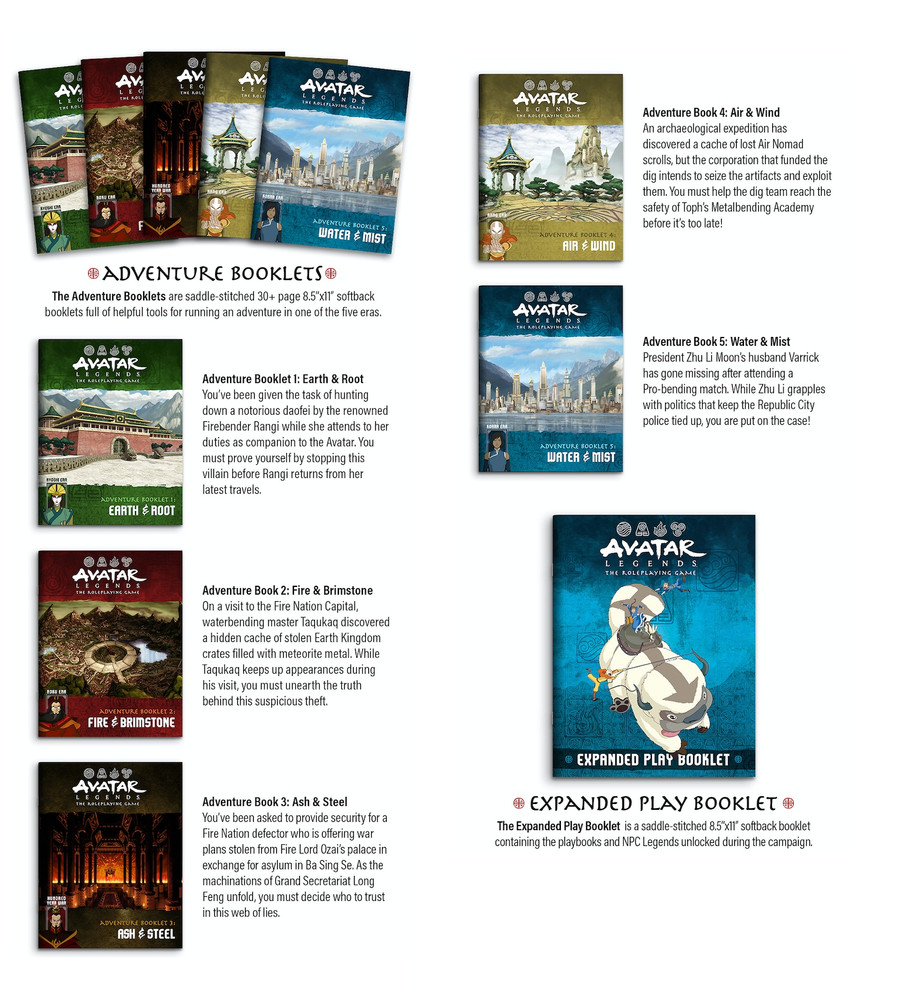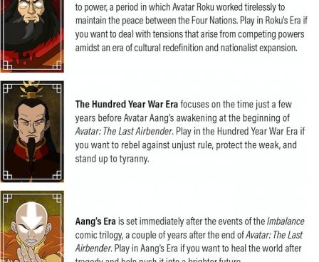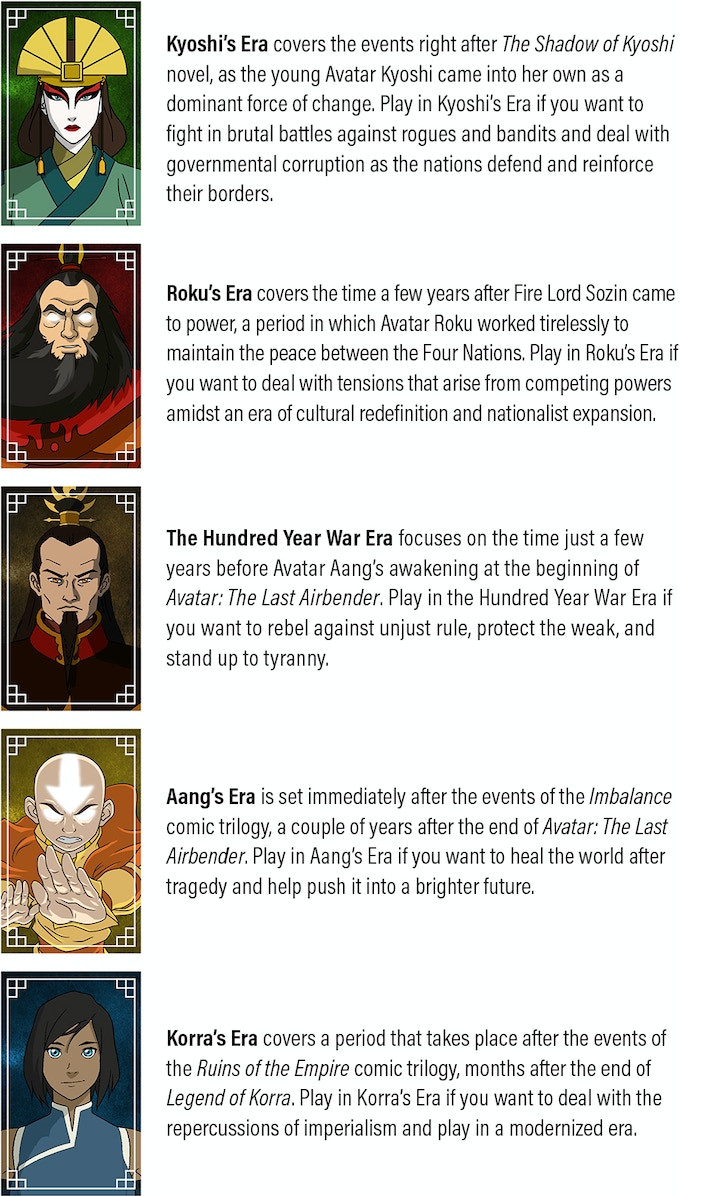 Each game of Avatar Legends: The RPG begins with your group picking an era as the backdrop for your game. Each era is tied to the span of an Avatar’s life—except for the Hundred Year War era during which Avatar Aang was frozen—and focuses on distinct themes which define your game. The full core book chronicles these eras more deeply, but here’s a quick list that describes the rough focus and details of each era:
