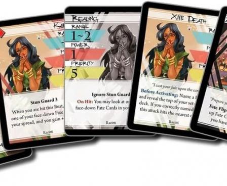 This box contains one complete Fighter for BattleCON. Raritti has a deck of fortune cards, which she uses in conjunction with her attacks to adjust the outcome of the duel. You may recognize a few of your favorite cards from the world of Millennium Blades in her deck!
