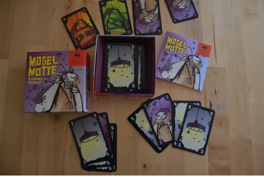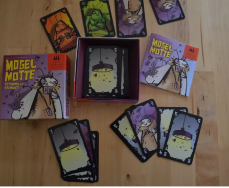 In Mogel Motte you want to get rid of all the cards in your hand before anyone else. Each player starts the round with a hand of eight cards, with one player (the oldest) receiving the guard bug – which stays on the table throughout the game – and one card being turnd face-up to start a discard pile. The cards are numbered 1-5, with the majority of them having only numbers; some cards have special abilities that come into play when added to the discard pile or in a player's hand.