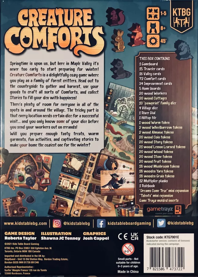 In Creature Comforts, you spend the Spring, Summer, and Fall gathering different goods from the forest and spending them to collect items that will make your home more inviting while the world outside is covered in a layer of snow. Each round you send family members out to various locations in an attempt to gain supplies. If they fall short of their goal, they’ll learn a lesson and be better prepared next time. The family that has created the most comfortable den wins the game.