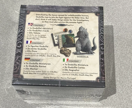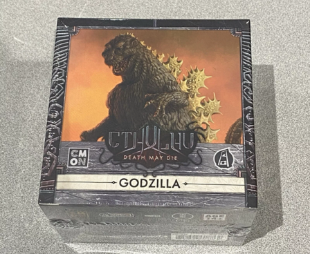 In Cthulhu Death May Die - Godzilla, you can choose to add Godzilla to any game. He isn't an enemy; investigators cannot interact with him. Think of him more as an uncontrollable force of nature. He starts in his Unruly Behavior phase, and every turn you roll a die to determine his actions. He might roar, causing investigators to lose sanity, stomp around, killing enemies and leaving Debris tokens that hinder investigators' movement, or even use his atomic breath to place fire and inflict wounds on all figures in a single zone.