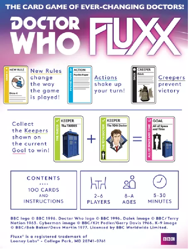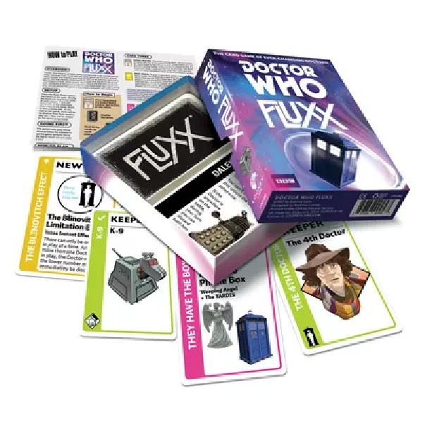 Doctor Who Fluxx takes the basic gameplay of Fluxx and merges it with multiple regenerations of the Doctor, various companions, Gallifreyan technology, K-9, Cybermen, Daleks, Weeping Angels, and the Master.