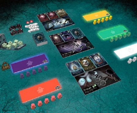 When 3 meeples have been placed into a room, the ghost dice are rolled. Depending on the result the placement of the meeples players will gain ghosts tokens. Next players will take cards from the room, depending on their meeple's position.