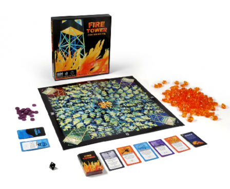 Fire Tower is a competitive game where players must fight fire with fire. Most fire fighting games have a cooperative aspect with players working together to beat back the flames, but in Fire Tower your only objectives are to protect your own tower and spread the blaze towards your opponents. The game plays 2-4 players, ages 12+, and takes 15+ minutes. Action cards allow players to alter the direction of the wind, and add varying patterns of fire, water, and defensive barriers to the board. The skill comes in effectively directing the resources in your hand and using sound spatial planning to deploy them.