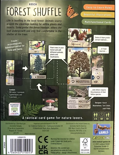 Forest Shuffle is the first in a line of Lookout games sporting the Lookout Greenline label, produced on FSC certified paper and avoiding plastic completely.