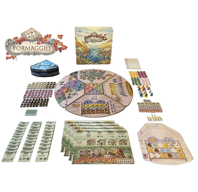 You are an Italian cheesemaker in the early 20th century making, aging, and selling your artisanal cheeses. Become the most prestigious cheesemaker in all of Italy by running a highly successful creamery and crafting exceptional cheese. Formaggio is a standalone expansion for Fromage. With both games put together, you can combine any 4 board quadrants, and draft any combination of structure tiles for more variety and more paths to victory.