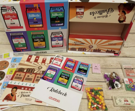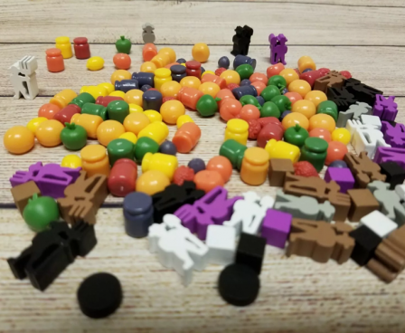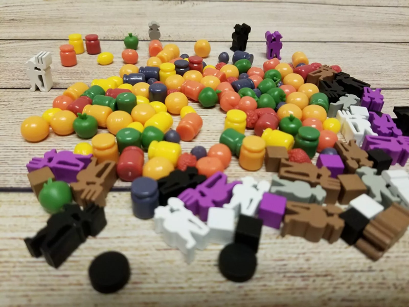This is a special Deluxe Kickstarter Edition. Instead of the wooden cubes, cylinders and standard meeples used in the standard version of the game, this version includes 144 3D contents: the fruits miniatures (74 fruits, divided among apples, strawberries, blueberries, peaches, lemons, and oranges) and jars of jams miniatures (42 jams of 6 different kinds), and the custom meeples in several colors.