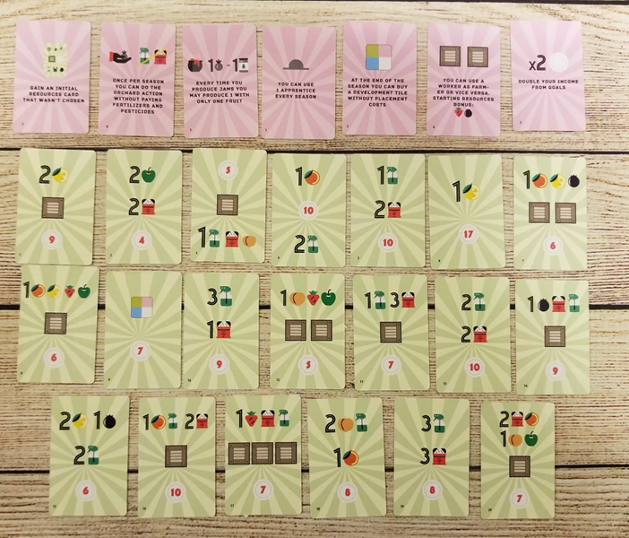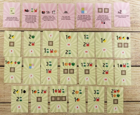 Some cards are very powerful and let you use many employees, but they will give penalties for the round (like not being able to sell your wares) and will give you a low position in the turn order; other cards are less powerful, but will give you benefits like free fertilizers, pesticides or development tiles, and will make you be first during the turn order, which will allow you to choose the best action space available!