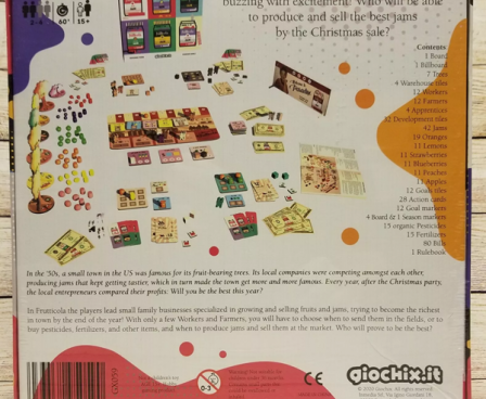 In Frutticola players will take on the role of business leaders specialized in growing and selling fruits and jams, trying to become the most rich in town by the end of the year! With just a few Workers and Farmers, you'll have to choose when to send them to the orchards and when to buy pesticides, fertilizers and other items in the shops. Who will prove to be the best entrepreneur?