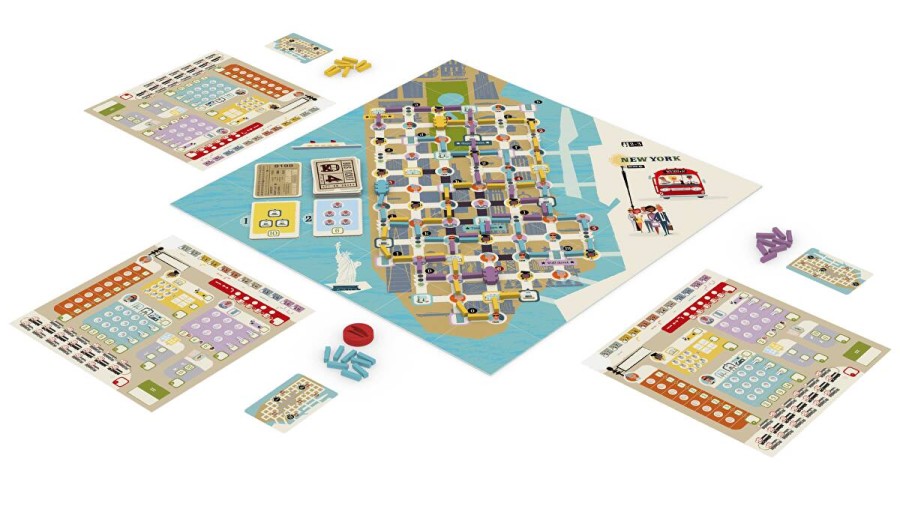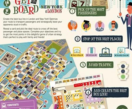 In Get on Board: New York & London, you have twelve rounds in which to build the best bus line in town. Each round reveals a new card that shows each player the route shape they must complete. Place your bus accordingly on the central board. Take the passengers where they want to go by connecting them and their destination to your bus line, avoid traffic, and gain as many victory points as possible!