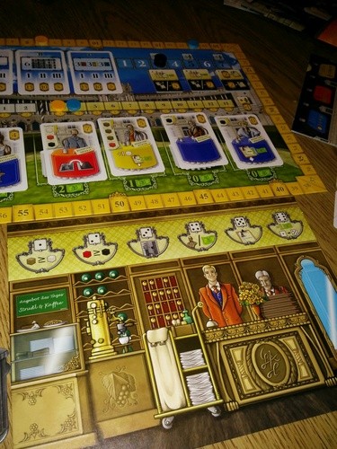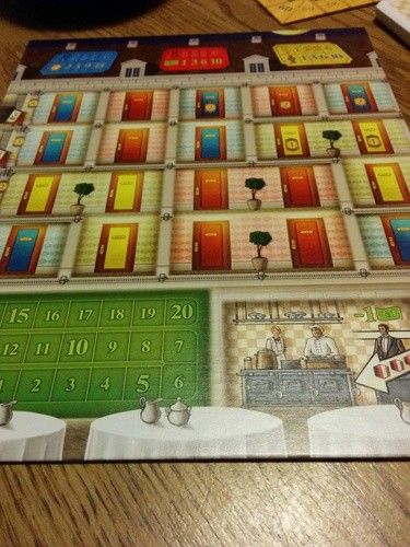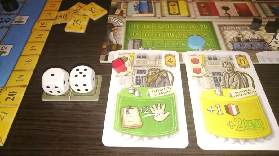 The start player rolls the dice, sorting them by the rolled number and placing them on the corresponding action spaces. On a turn, a player chooses one of the six actions and carries it out. The number of the available dice in the corresponding action spaces determines how much the player gets from the action. They then remove one of the dice and can carry out additional actions. With the different actions, a player can get the necessary drinks and dishes, prepare the rooms, or hire staff.
