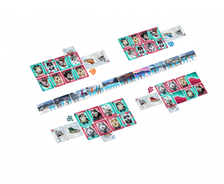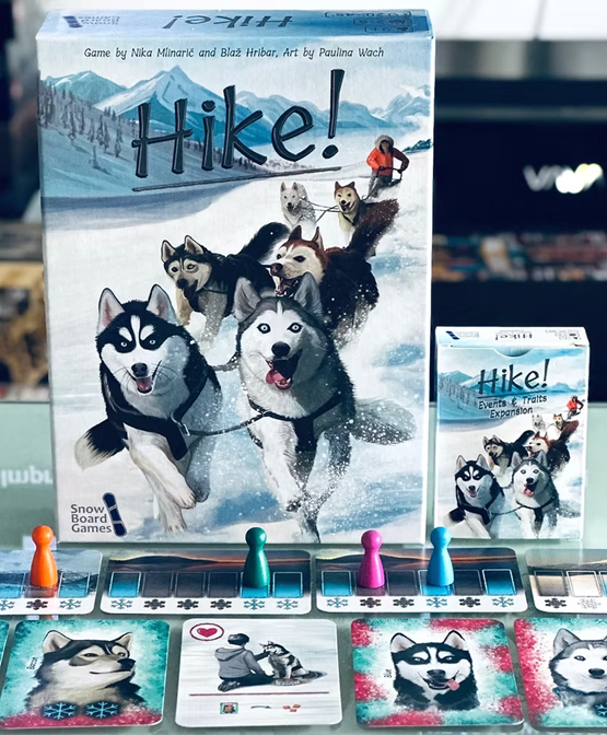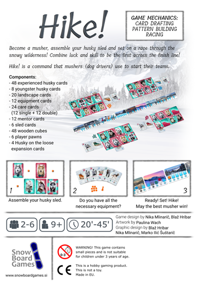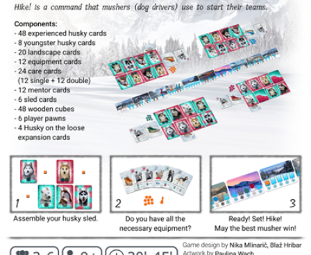 Hike! is a light and fast game in which players take on the role of mushers (dog drivers) competing in a dog sledding race. First, they assemble their husky sleds and prepare the equipment they will need for the race. They hand-pick the huskies for their abilities and pay special attention to where in the sled they place them to form a strong and harmonized team. And then, the race is on! Who will have the winning tactics and whose team will perform best in the treacherous terrain? The first one across the finish line is the winner!