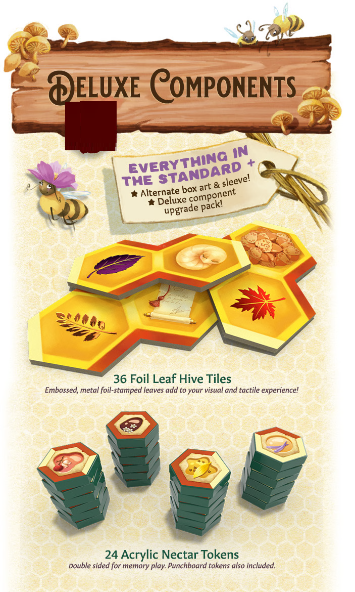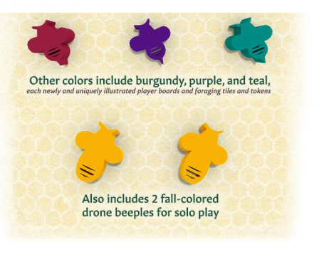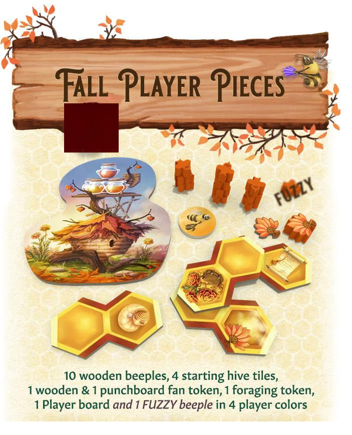 Includes 10 wooden beeples, 4 starting hive tiles, 1 wooden & 1 punchboard fan token, 1 foraging token, 1 Player board and 1 FUZZY beeple in 4 player colors. Also includes 2 fall-colored drone beeples for solo play.