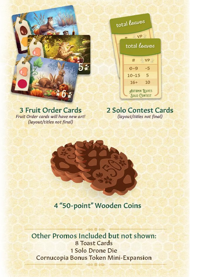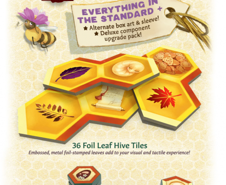 Fall Fruit – Forage in a new field of flowers and collect fruit instead of pollen. Sell your collected apples, pears, and pumpkins at the market or save them up to complete special new orders for honey-dipped fruit. – Autumn Leaves – Collect colorful leaves found on the new leafy hive tiles as a means of decorating your hive for the queen. Score points for the leaves in your hive, based on the foliage card in play for that game. – Nectar Caps – Put caps on your nectar cells to prepare for winter. Nectar caps are worth lots of points and might even earn you a trophy, but they slow down your economy because capped nectar tiles cannot produce honey! – Harvest Festival – Trim your labor force by retiring your workers and sending them off to the harvest festival. As each worker retires, you choose whether they propose a toast or work one last time. – Sweetwater Sunset – When playing with Fall Flavors, use the new sunset board to track progress towards the end of the game. When the sun sets on Sweetwater Grove, winter has arrived, and the game will end.