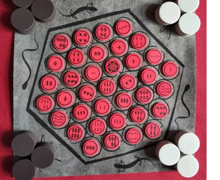 To start, the black player places one of their pawns on a perimeter space that touches only one side of the hex. The token on this space, e.g. the red fish, indicates where the white player must place one of their pawns on the next turn, either on a red token or on a fish token, and the white player's pawn constrains where the black player can next place a pawn. Players continue taking turns in this manner, and the game ends immediately when one of three victory conditions are fulfilled: