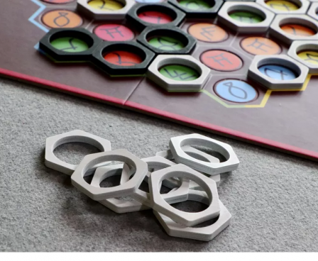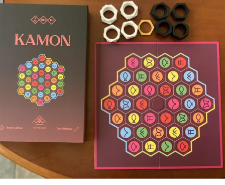 To set up the two-player abstract strategy game Kamon, shuffle the game's 37 tokens and fill the hexagonal grid with one token on each hex. The tokens consist of one blank token and 36 tokens in six colors and six symbols, with each combination appearing once. (In earlier versions of the game, tokens were valued 1-6 in each of six different symbols, with one hex being left empty.) The blank token fills space and serves only as a barrier.