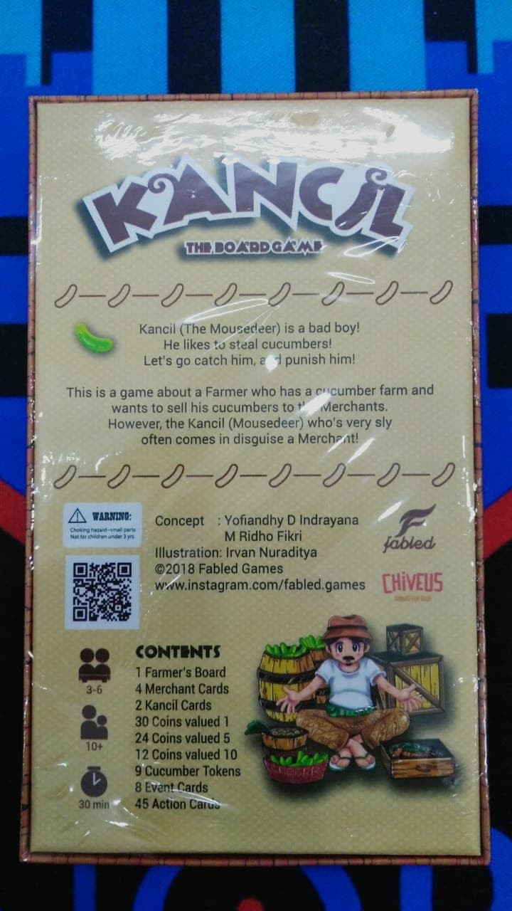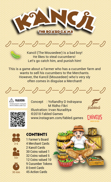 Kancil is a hidden role game for 3-6 players that revolves around the art of negotiation between a farmer and the merchants involved. Players take turns as the farmer with a simple task: Sell their handgrown cucumbers to the merchants and make an honest living out of it. The goal of the game is to earn the most profits through successful deals.