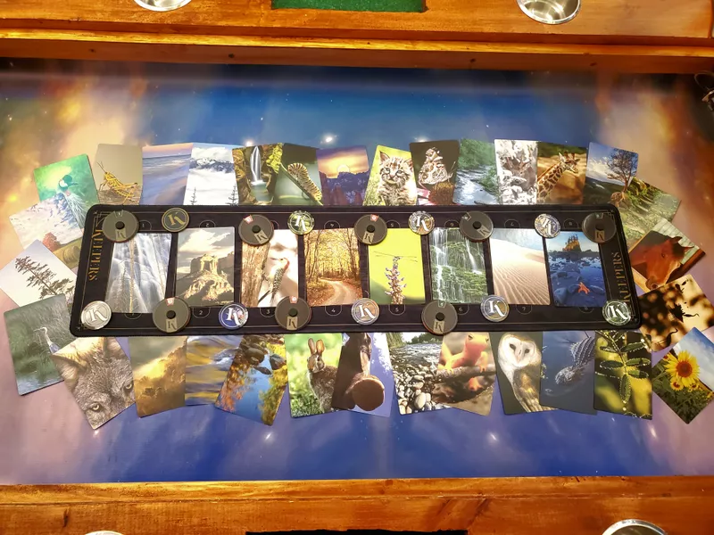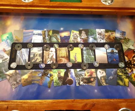In Keepers each player takes a turn as Curator, choosing one (can’t be a noun!) word to describe a card in their hand and announcing it. All players including the Curator then play a card that they think aligns the most, or the least, with that word, they are shuffled and placed face up to a numbered slot in middle of the table. All players then vote and the cards that get the most votes either way is a “Keeper” and earns the owner one point! Through clever word use by giving great clues one Curator will rise to the top and claim the most Keepers!