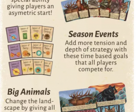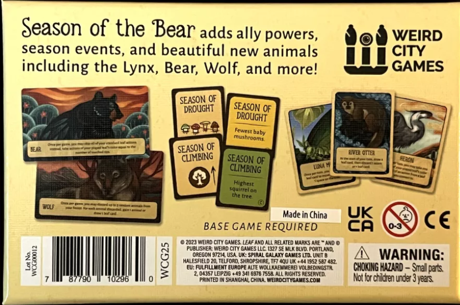 The Season of the Bear expansion offers three advanced play modes that can be added to the game Leaf. Animal Allies give each player a unique ability they can use throughout the game. Season Events add extra scoring conditions to each Frost. The Greater Animals affect the whole forest, giving each player an effect they can use once per game.d Game