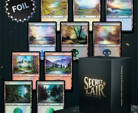 This is a real special treat we have today. This drop includes ten different basic lands: that’s two Plains, two Islands, two Swamps, two Mountains, and two Forests—each one with a unique piece of art by Bob Ross. That’s ten different pieces by the patient and soft-spoken legend, presented in beautiful foil. Whether you use them to add some joy to your deck or put them on display, we know these happy little cards will be right at home in your collection.