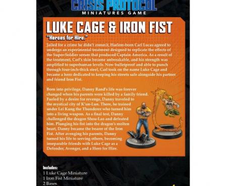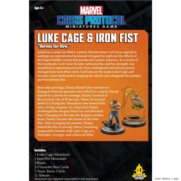 Marvel: Crisis Protocol – Luke Cage & Iron Fist consists of 2 miniatures, 2 Bases, 2 Character Stat Cards, 3 Team Tactic Cards, and 11 Tokens.