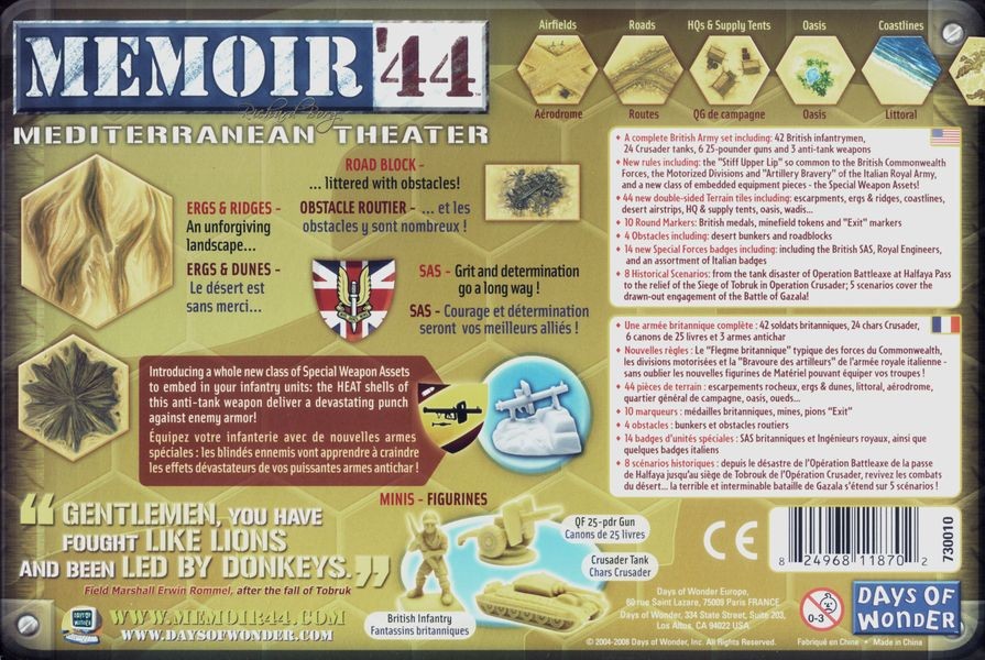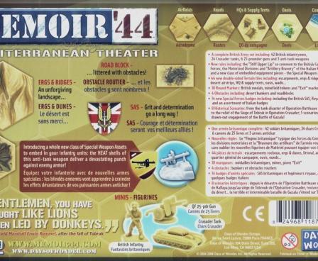 The Mediterranean Theater Expansion introduces British Army figures and rules to the Memoir '44 game system, as well as a whole new class of Special Weapon Assets to embed in infantry units. Also included are eight new historical scenarios in North Africa, 44 new, double-sided Terrain tiles, plus new obstacles, markers, and special-forces badges.