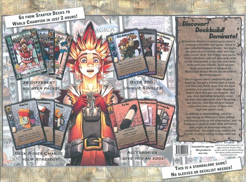 At its heart, its a commodity trading game, except that instead of cubes or stocks, the things youll be buying, selling, and speculating on are trading cards that can be used throughout the game in periodic tournaments. By trading wisely, playing the market, working together with friends, building collections, and winning tournaments, youll secure points and become the Millennium Blades World Champion.