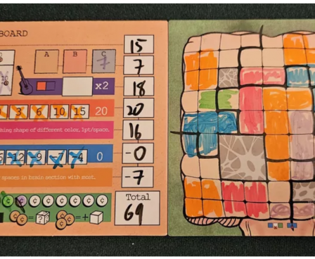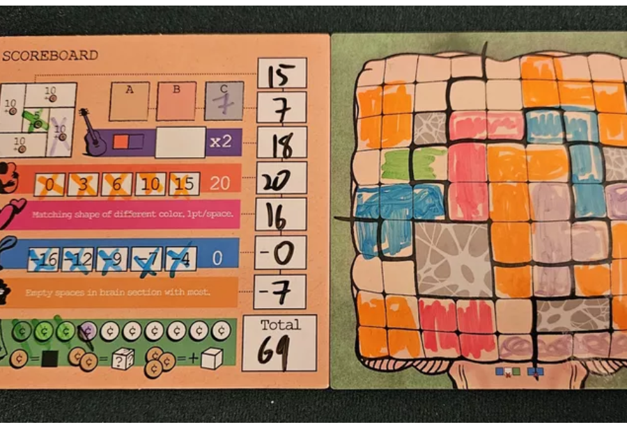 After 12 rounds, the game is scored, and points can be earned by completing sections of the brain, achieving public goal cards, and meeting the organizational criteria of each color. The one section of each Brain Board with the most unfilled squares will result in a deduction of 1 point for each unfilled square in that section