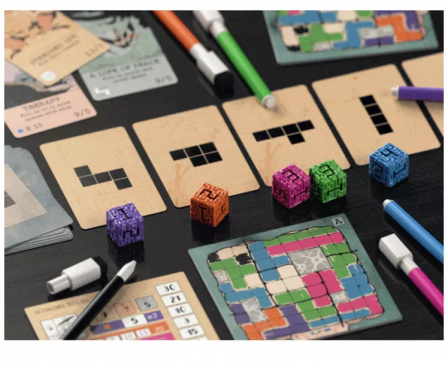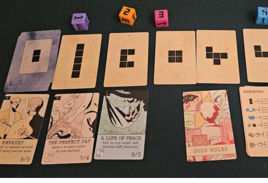 Each emotion is represented by a polyomino shape. Five of the possible Seventeen emotion cards will be available each round, and five rolled dice will determine which colors can be used to add those shapes to a Brain Board.