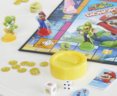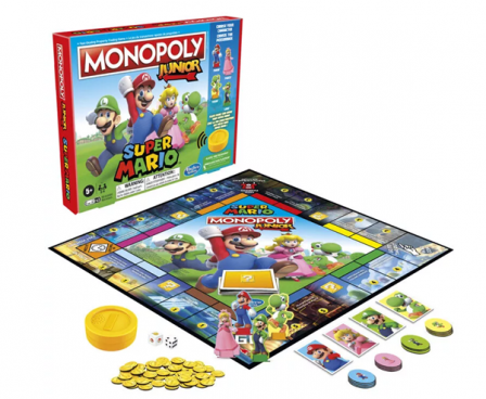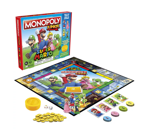 In this Monopoly Junior board game kids can imagine exploring the Mushroom Kingdom with Super Mario artwork, themes, and gameplay. Players move around the gameboard as Mario, Peach, Yoshi, or Luigi buying up properties and collecting coins. The player with the most coins wins. Players roll the power-up die to find out if they can press the Coin Sound Unit featuring the iconic coin sound from Super Mario, and collect coins. Board spaces feature scenes and themes Super Mario fans will recognize including Yoshi's Hill, Cooligan Fields, and Rock-Candy Mines. Monopoly Junior is a good introduction to the Monopoly game. It's designed to be fast, fun, and exciting for younger players.