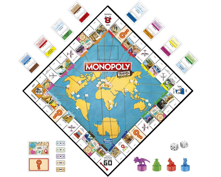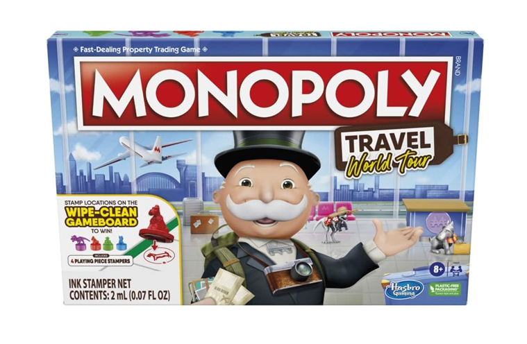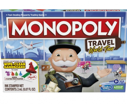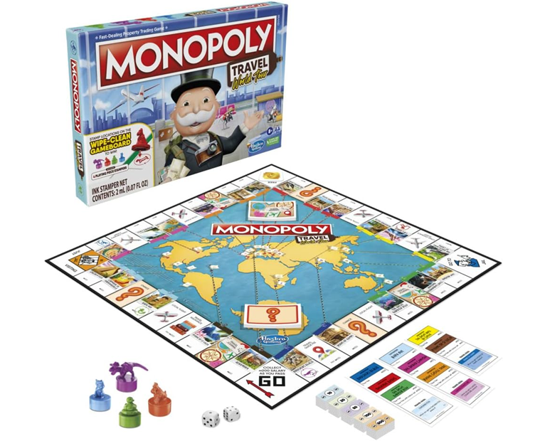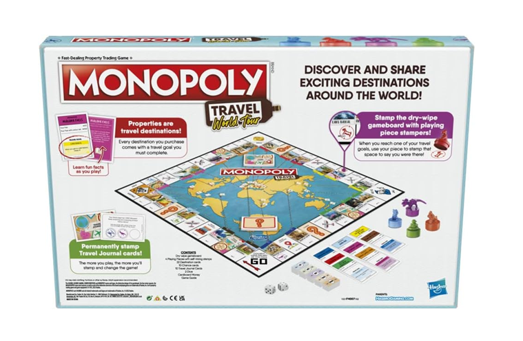 MONOPOLY TRAVEL GAME: In this edition of the Monopoly game, properties are destinations. Destination cards include travel goals and location facts. Players stamp the dry-erase gameboard with token stampers to complete goals. Fun kids games or travel board games for adults and kids!