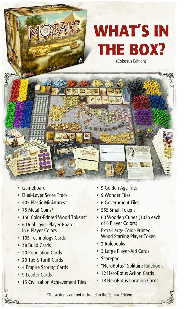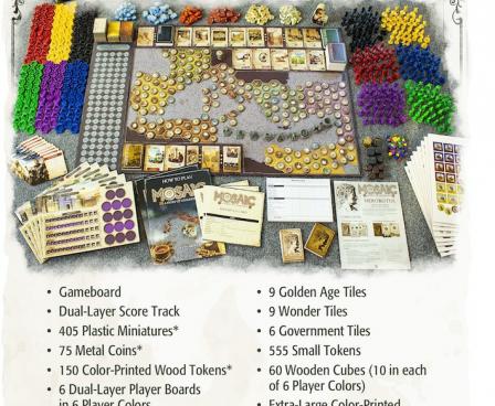 Includes a Deluxe Edition "Colossus" Mosaic: A Story of Civilization Boardgame, PLUS 75 Metal Coins, 140+ Wood Tokens, 400+ Plastic Miniatures, Larger Box, and high-quality plastic in-box storage.