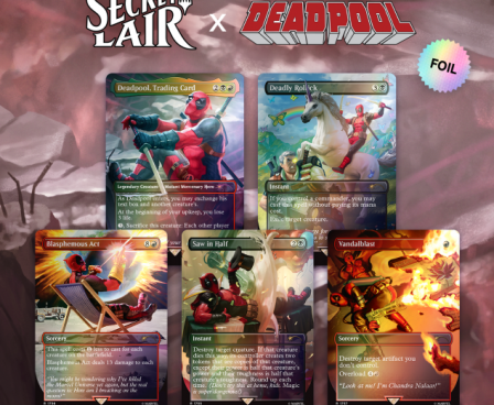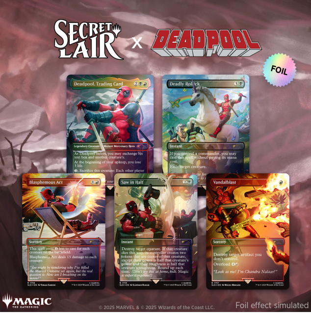 But I wasn’t expecting guests. Just, uh, kick back, relax, and . . . don’t sit on my red suit! It’s drying out. But check this out—Secret Lair made me my own Deadpool cards! Isn’t that nice? So pretty. This one even says, “trading card,” so you don’t forget. Anyway, make yourself comfortable and if you need anything, I’ll be in the kitchen making chimichangas.