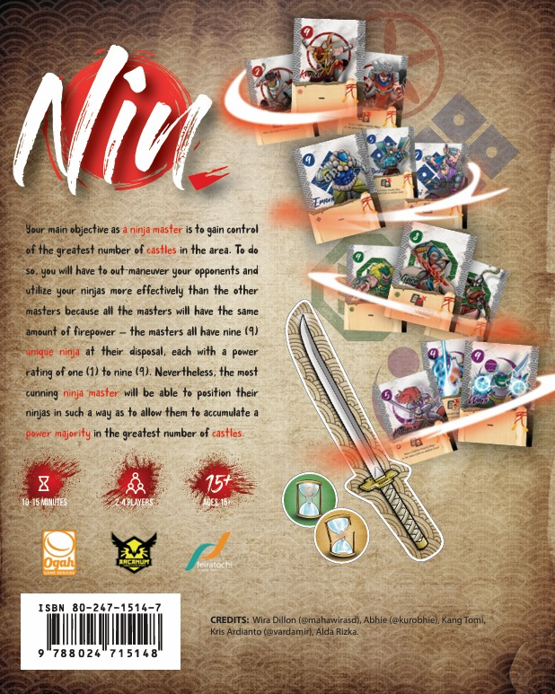 Nin. dapat dimainkan oleh 2, 3, atau 4 orang dengan durasi permainan rata-rata sekitar 10 sampai 15 menit. Walaupun Nin. menghadirkan 36 ilustrasi karakter yang unik hasil torehan ilustrator @kurobhie, sejatinya setiap Ninja Master akan memiliki 9 kartu ninja dengan kekuatan yang sama. Dengan desain yang memiliki elemen ninja dan aturan permainan yang menantang namun mudah dipelajari, Nin. dirancang tidak hanya untuk menghibur tetapi juga untuk mengasah keterampilan berpikir adaptif untuk memenangkan permainan.