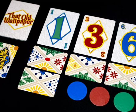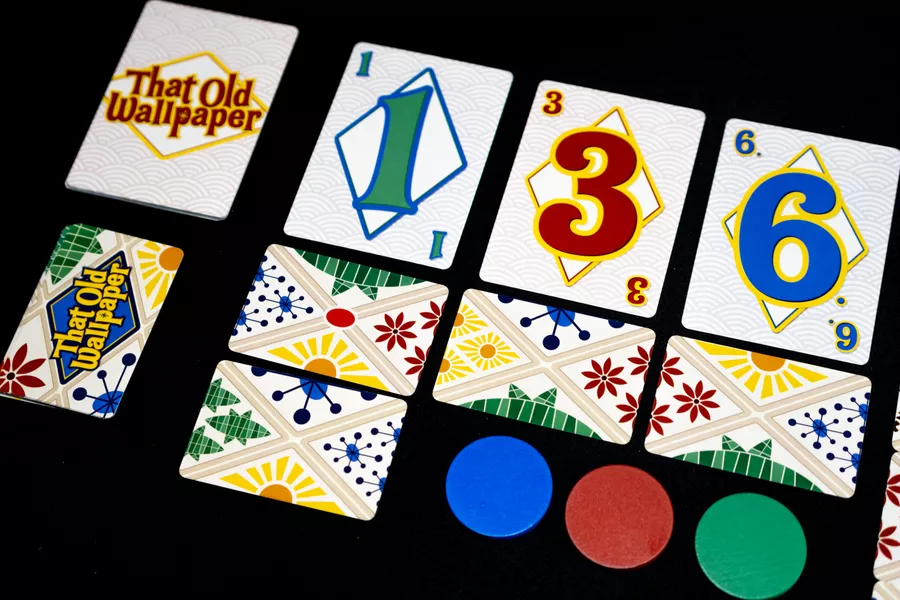 When you receive regular wallpaper cards, you must add them to your other played cards immediately, ideally matching the pattern halves to create a complete pattern. Patterns come in four colors, with each color having two sizes. A wild pattern is also available, which seems kind of weird, but so be it. To end a turn, deal a new wallpaper card to each location, which means that some locations will likely have more cards than other ones.
