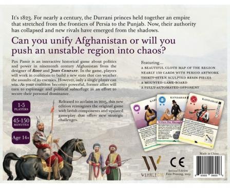 In Pax Pamir, players assume the role of nineteenth century Afghan leaders attempting to forge a new state after the collapse of the Durrani Empire. Western histories often call this period "The Great Game" because of the role played by the Europeans who attempted to use central Asia as a theater for their own rivalries. In this game, those empires are viewed strictly from the perspective of the Afghans who sought to manipulate the interloping ferengi (foreigners) for their own purposes.