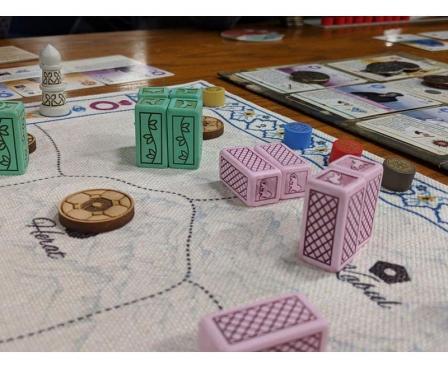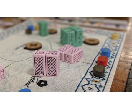 In terms of game play, Pax Pamir is a pretty straightforward tableau builder. Players spend most of their turns purchasing cards from a central market, then playing those cards in front of them in a single row called a court. Playing cards adds units to the game's map and grants access to additional actions that can be taken to disrupt other players and influence the course of the game. That last point is worth emphasizing. Though everyone is building their own row of cards, the game offers many ways for players to interfere with each other directly and indirectly.
