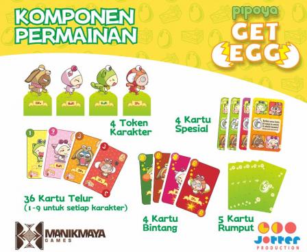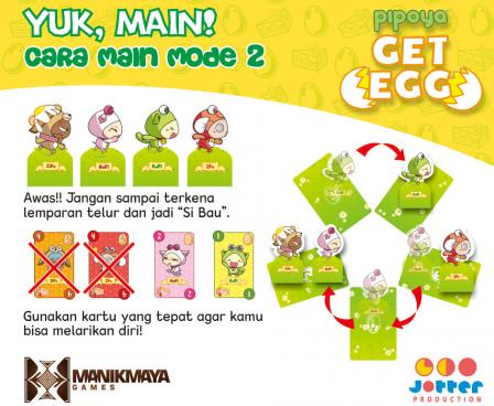 Kamu akan mendapatkan tidak hanya satu tapi dua mode permainan (2 in 1) dalam satu box Get Egg card game. Mode permainan pertama menceritakan kisah HaPi, JiPo, IPo, dan KuPi bertualang untuk mengumpulkan telur dan memasak kue yang lezat. Tapi kamu harus mengumpulkan telur yang bagus saja.