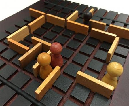 The abstract strategy game Quoridor is surprisingly deep for its simple rules. The object of the game is to advance your pawn to the opposite edge of the board. On your turn you may either move your pawn or place a wall. You may hinder your opponent with wall placement, but not completely block him off. Meanwhile, he is trying to do the same to you. The first pawn to reach the opposite side wins.