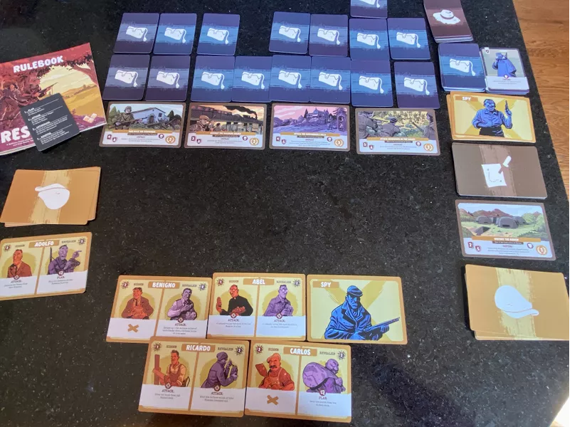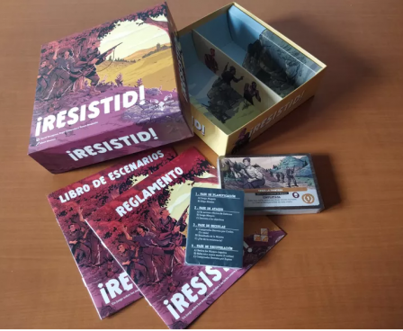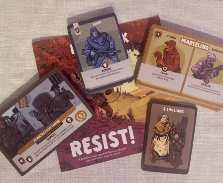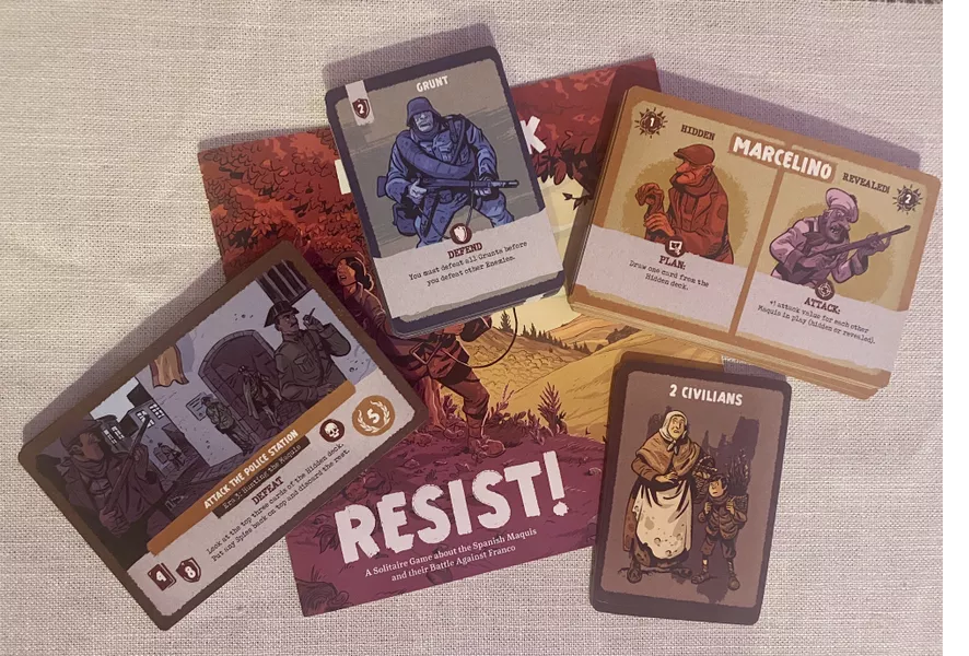 Resist! is a fast-playing, card-driven solitaire game in which you take on the role of the Spanish Maquis, fighting against the Francoist regime. Over a series of rounds, you undertake increasingly difficult missions, and completing missions earns you the points needed to win. Failing to defeat missions and enemies may cause you to lose. At the end of each round, you must choose whether to end the resistance or risk it and take on another mission.