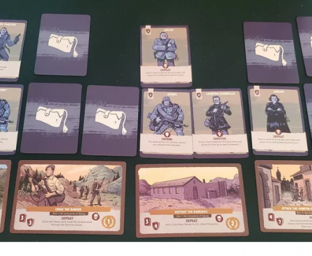 At the beginning of the game, you assemble a team of twelve Maquis, which are represented by a deck of cards. At the heart of the game is the tension between keeping your Maquis concealed from Franco or revealing them to unlock their full potential. Unfortunately, revealed Maquis are removed from your deck, and you likely won't be able to use them for the rest of the game. While Resist! does have some minor deck-building elements, it is primarily a "deck-destruction" game in which you have to manage your deck, balancing the decision of defeating the immediate threat with trying to move on to the next mission.