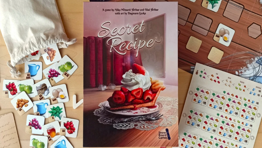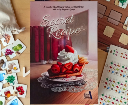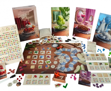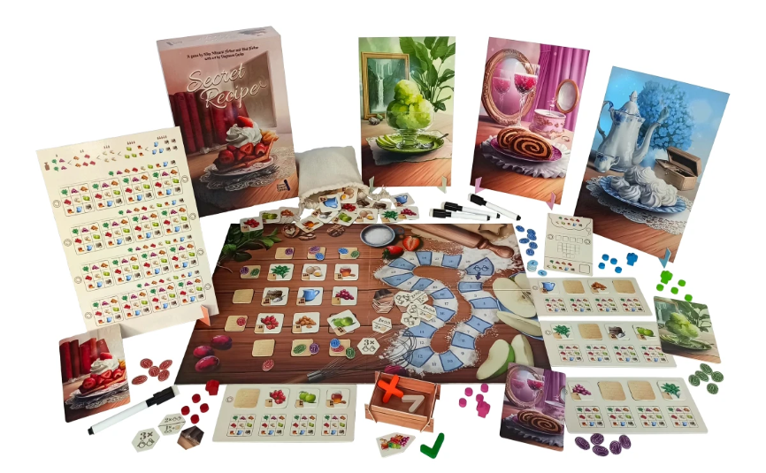 In Secret Recipe, each player receives one or two pieces of the recipe with 4 hidden ingredients that only they know. The goal of the game is to impress grandma and score Grandma’s points (GPs). You can do that by discovering other people’s ingredients, which moves you forward on the score track.